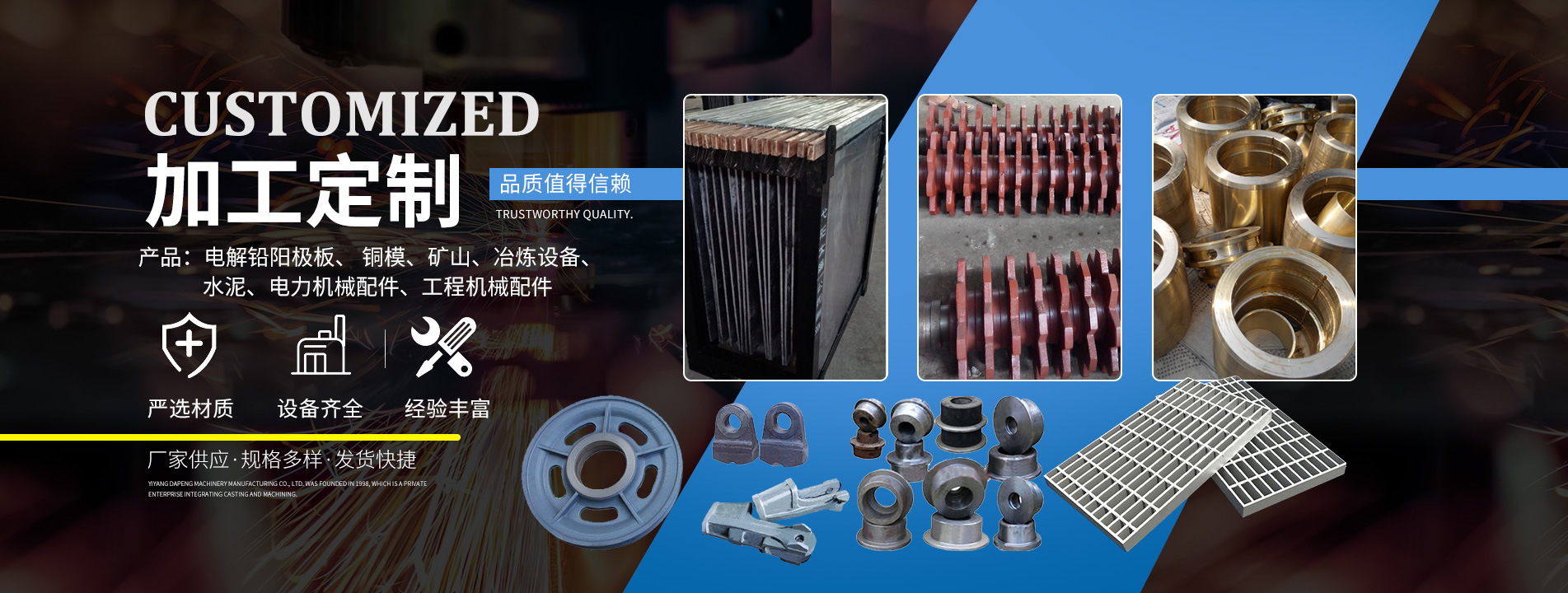主要產(chǎn)品有:電解鉛陽極板、 銅模、礦山、冶煉設(shè)備、水泥、電力機(jī)械配件、工程機(jī)械配件