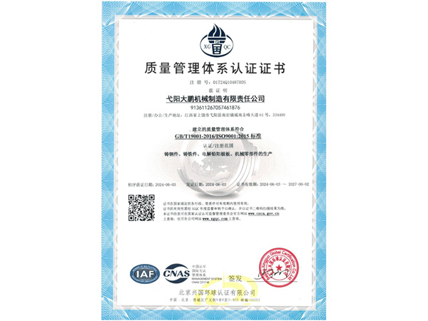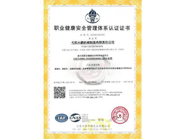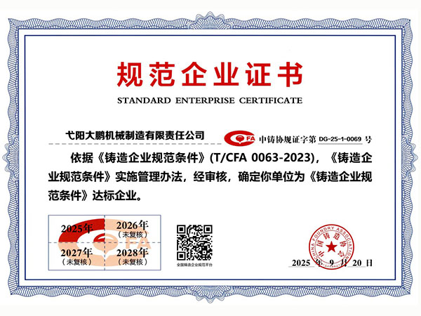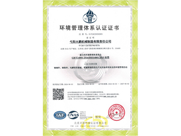 公司順利通過質(zhì)量管理體系認(rèn)證、環(huán)境體系認(rèn)證、職業(yè)健康安全管理體系認(rèn)證、環(huán)評。2015年5月獲國家工信委頒發(fā)的《鑄造企業(yè)準(zhǔn)入條件》;2019年做了安全現(xiàn)狀評價(jià);2020年取得了排污許可證。